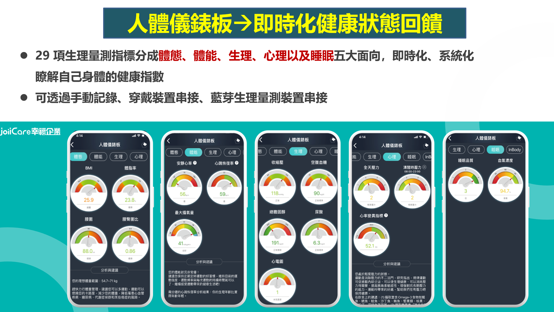 JoiiSports 企業運動app透過其「人體儀錶板」功能,收集了 29 項對個人健康評估十分重要的生命體徵數據。這包括身體質量指數(BMI)、體脂肪、安靜心率、血壓、壓力水平以及睡眠模式等直接輸入數據[5]。這些數據為理解個體的基礎生理狀態提供了重要的基礎。