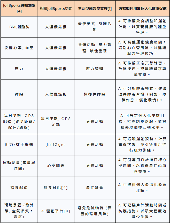 表一:JoiiSports數據與生活型態醫學支柱的對應關係