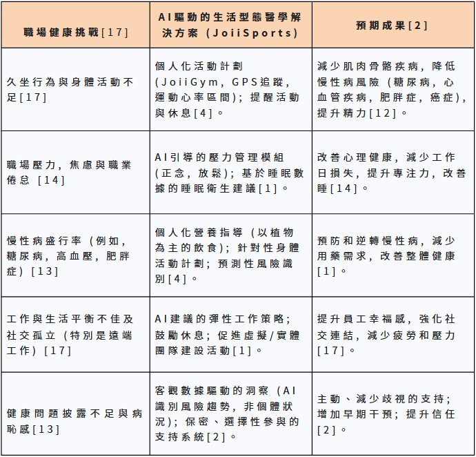 表二總結了全球職場主要健康挑戰,並將其對應至透過 JoiiSports 企業運動app實施的 AI 驅動生活型態醫學解決方案,為雇主提供一個清晰且具行動導向的實施框架。