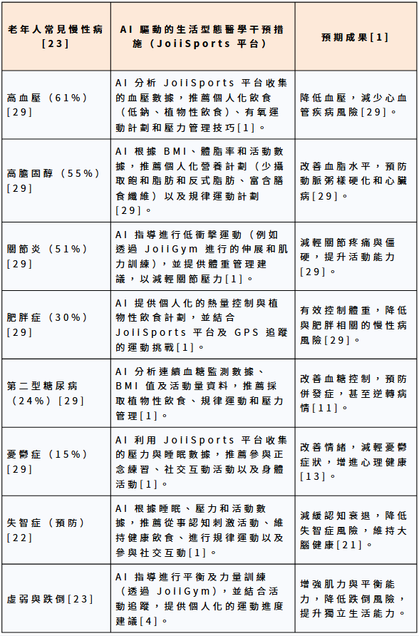 表三詳列了老年人最常見的慢性病,並將其與透過 JoiiSports 數據和人工智慧能力強化的、有實證基礎的生活型態醫學干預措施相連結,這直接回應了用戶對「銀髮經濟」解決方案的需求。