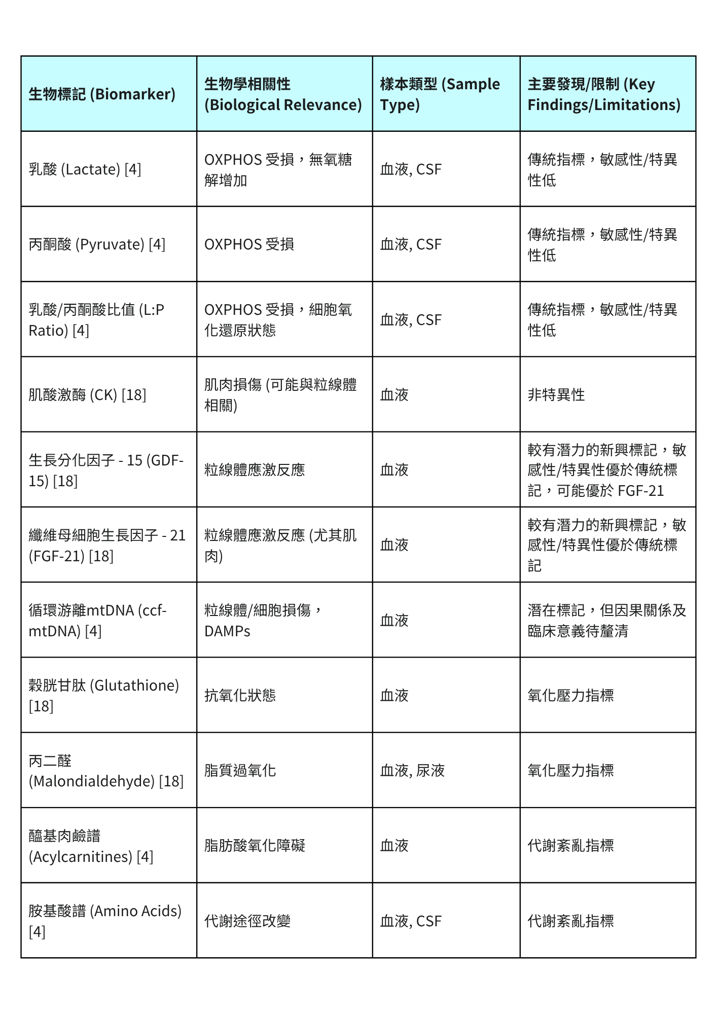 表 1:粒線體功能障礙主要生物標記總結