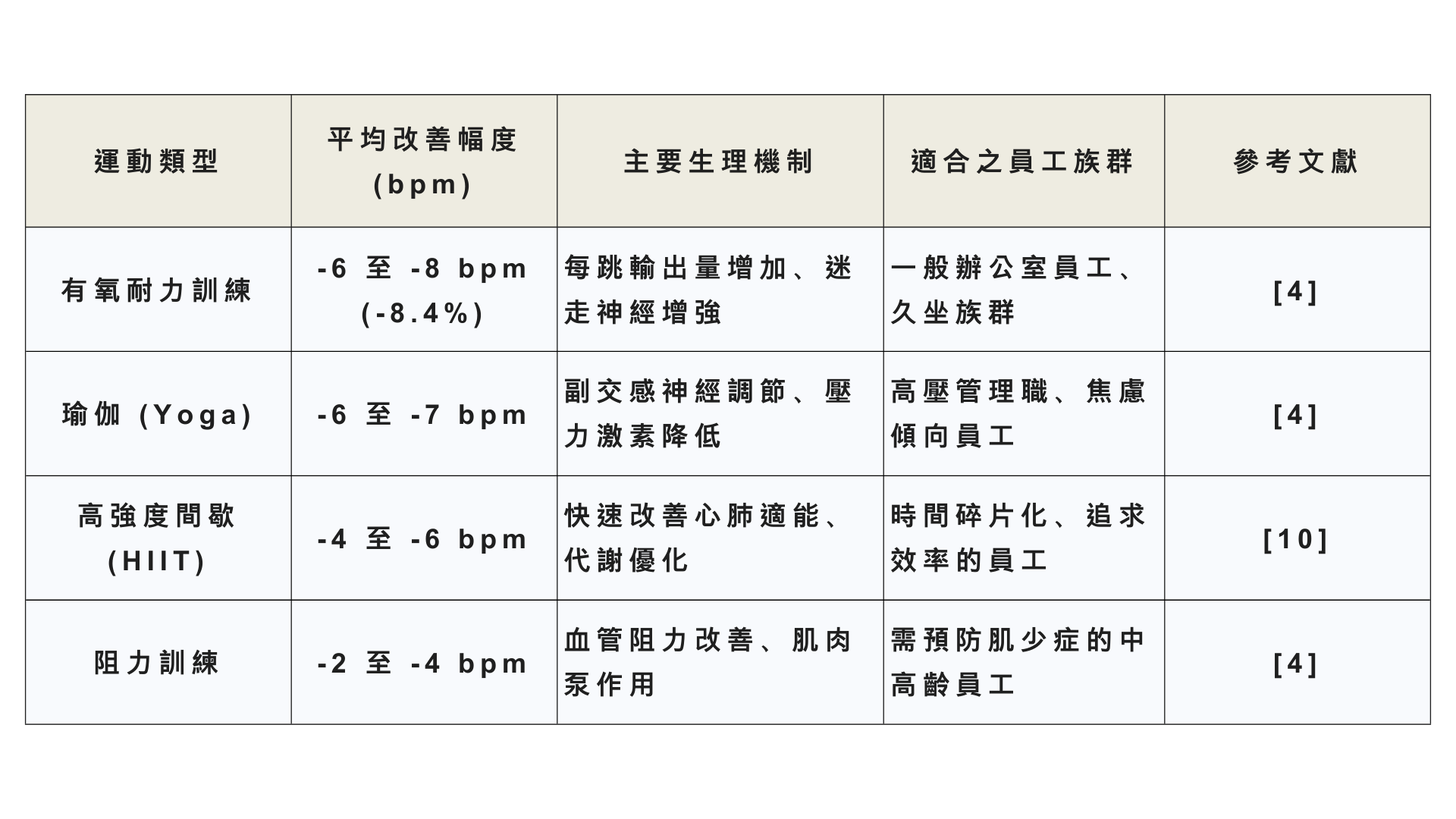 研究顯示,規律有氧與阻力訓練可降低 RHR、提升 VO2max,並改善 HRV 等指標,這些「個人層級」的改善,會在組織層面累積成可觀效益:
