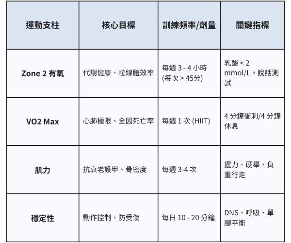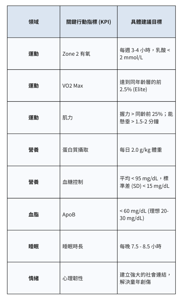 3. 行動實踐:建立以 Zone 2 有氧和肌力訓練為核心的運動習慣,攝取足夠蛋白質,優化睡眠環境,並正視內心的情緒健康。