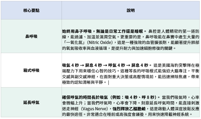 透過以下三種刻意練習,我們能重新奪回對神經系統的控制權,讓呼吸成為最強大的能量管理工具: