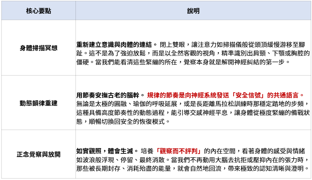 透過以下修心與具身(Embodied)的實踐,我們能將被封存的負面能量,重新轉化為支持當下行動的動力: