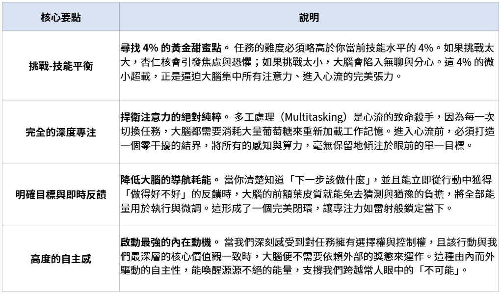 心流不是一種隨機降臨的靈感,而是一組可以透過精確設定環境與心智來主動觸發的神經生物學開關: