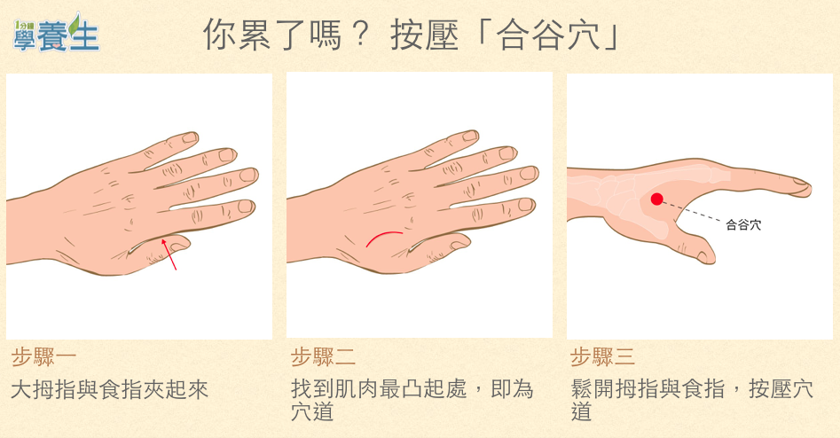 「合谷穴」是臨床上常用穴道,方便好找,按壓「合谷穴」能刺激全身氣血運行,提振精神。