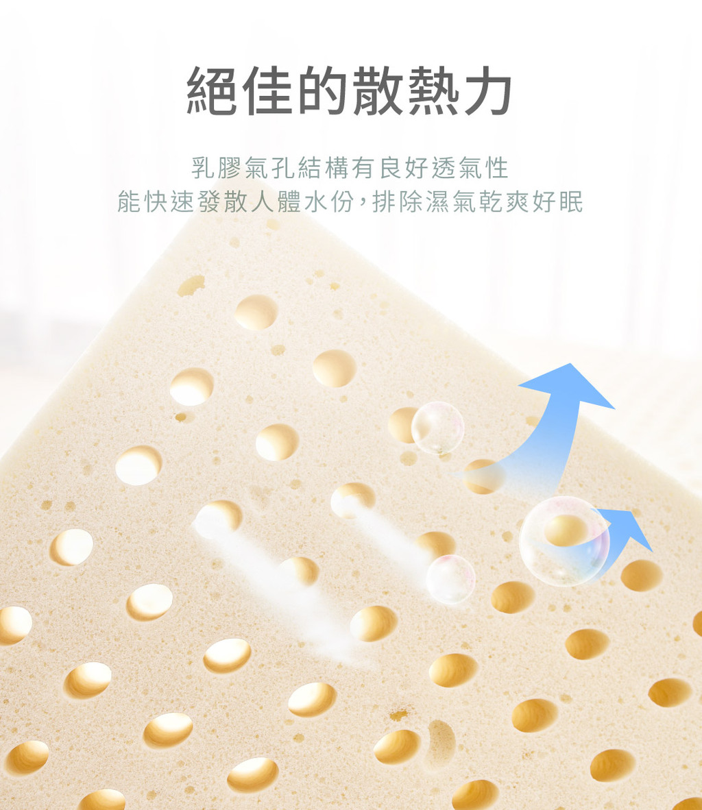 乳膠氣孔結構擁有良好透氣性,排除濕氣乾爽好眠