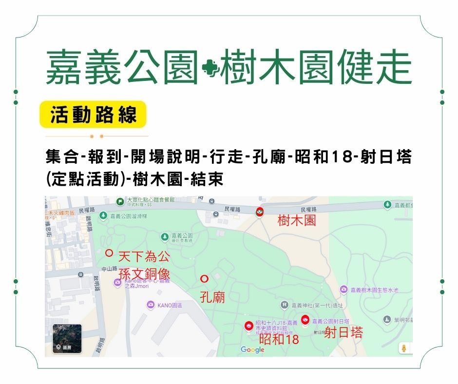 二、健走路線:嘉義公園面積廣大而多元,園區內綠意盎然、更可窺見歷史軌跡,保留許多日式排樓與建築,走訪感受其文化之美。森療師導引大自然林地深呼吸,暢遊嘉義最有人文風情的健走路線。