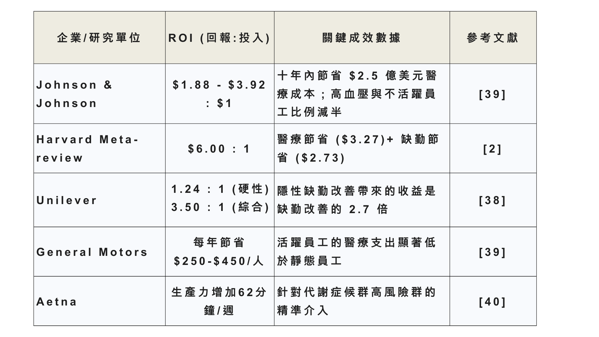 2. 企業健康計畫 ROI 在回顧研究中常見落在 1:1.5 至 1:6 [2]。