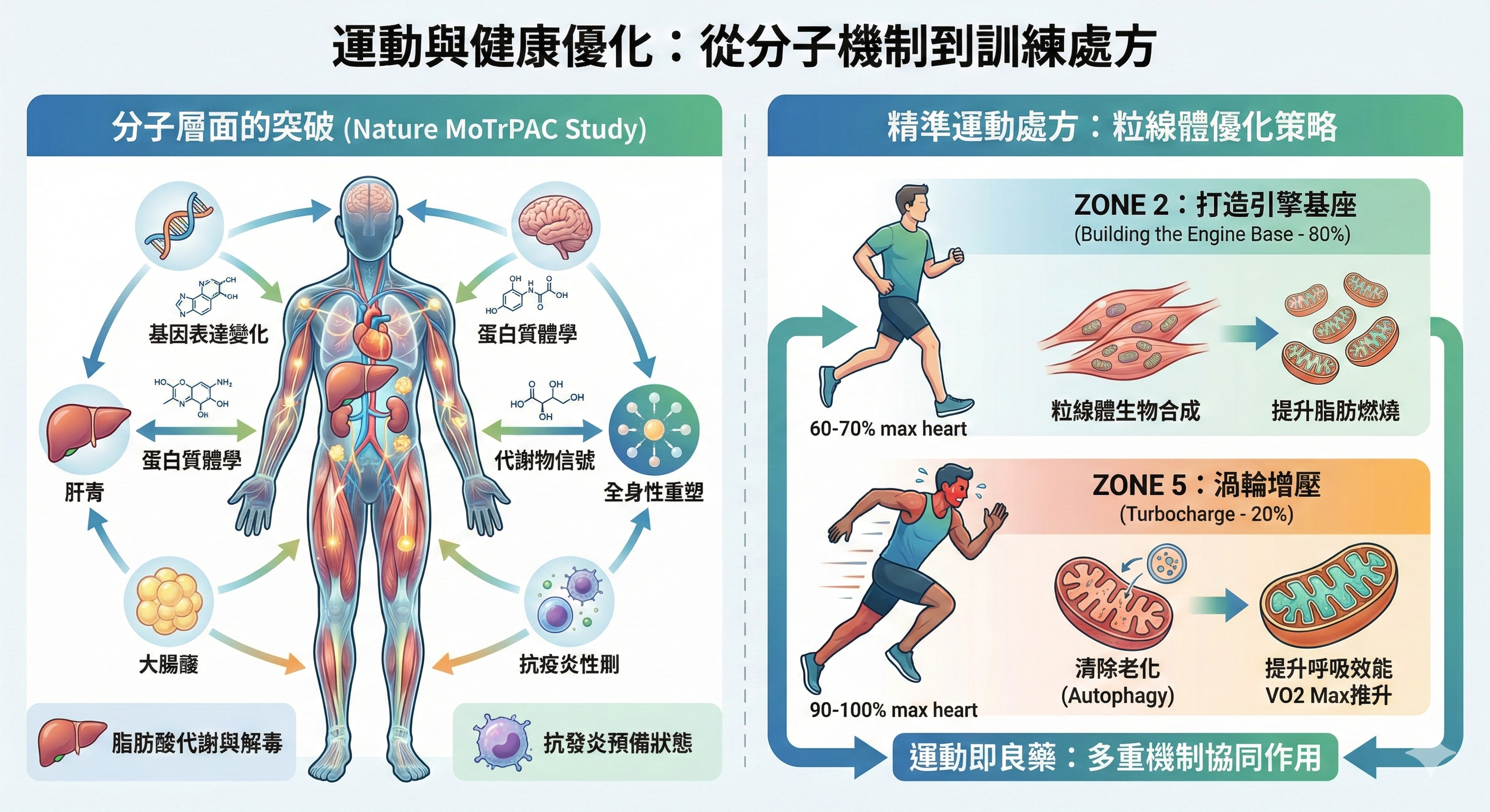 Nature 的研究 [1]告訴我們運動能重塑全身分子, Zone 2 是負責「廣度」(讓全身細胞都動員起來改善代謝),Zone 5 則是負責「深度」(強化心肺極限與清除老化粒線體),兩者缺一不可。