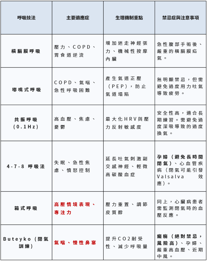 下表總結了主要呼吸技法的特點、適應症與潛在風險: