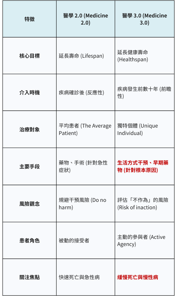 醫學 3.0 是阿提亞醫師倡導的未來醫學範式,其核心目標是實現健康壽命與壽命的同步延長。