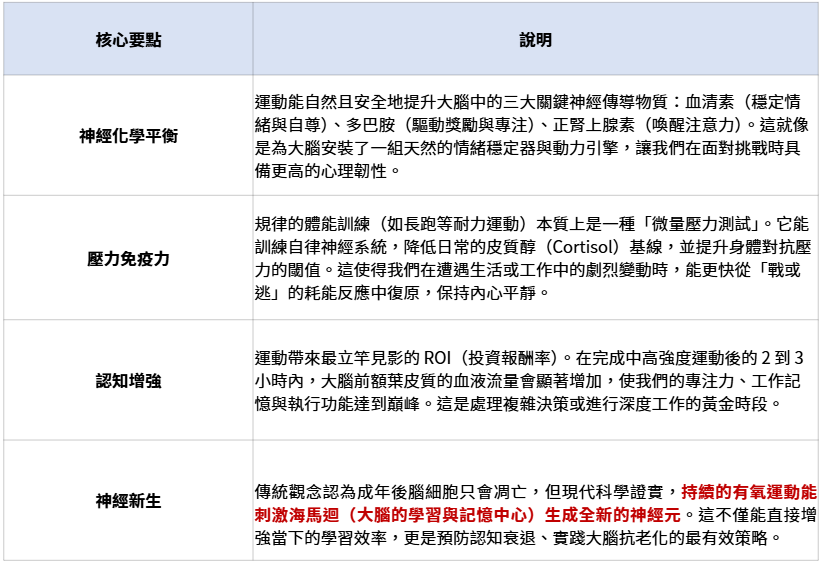 透過系統化的身體活動,我們實際上是在經營一座由內而外的「內部藥局」,精準調控我們的精神狀態與認知效能: