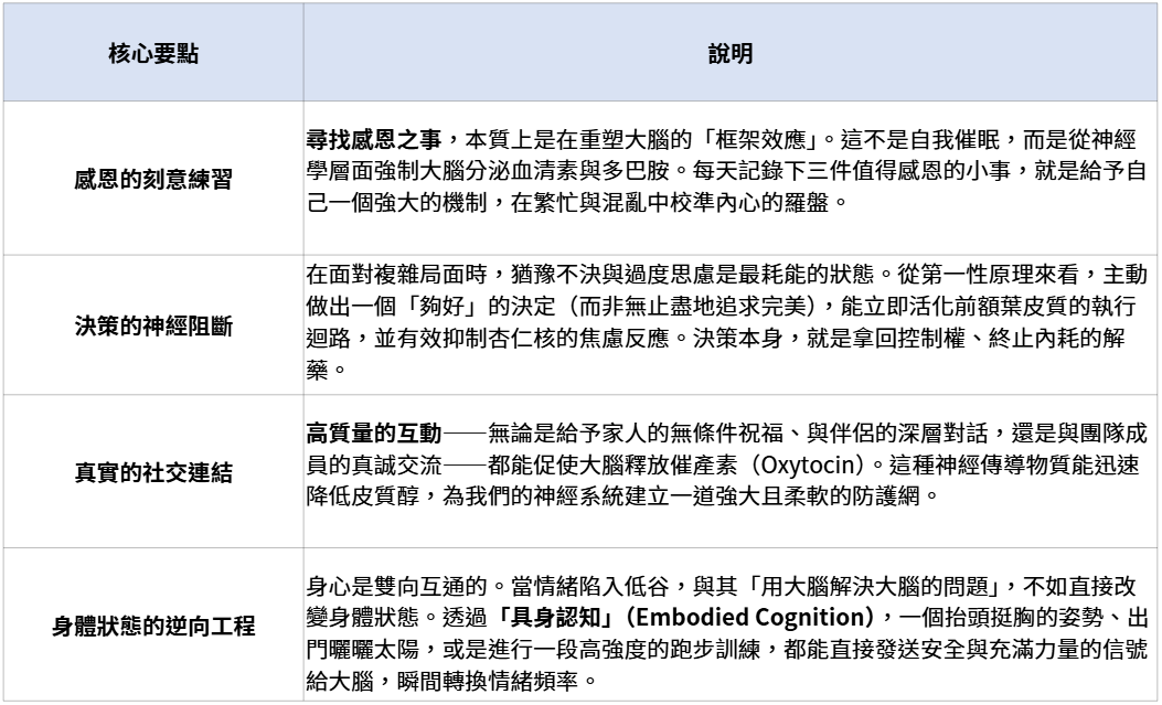 當情緒卡關或面臨巨大壓力時,我們可以透過以下四個科學驗證的機制,主動介入並重塑大腦的狀態: