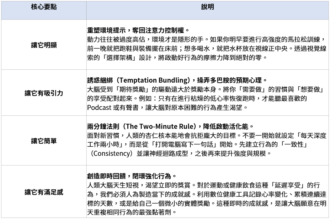 要將優化身心能量的行為(如早起訓練、深度專注、正念呼吸)深植於生活中,我們必須精通大腦的「習慣迴路」。以下四大法則,本質上就是一套個人化的行為助推(Nudge)系統,幫助我們毫不費力地做出正確選擇: