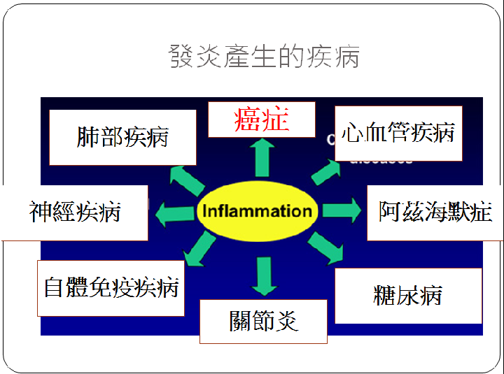 我們減少身體越多發炎就會越健康,身體發炎相關的疾病有以下疾病: