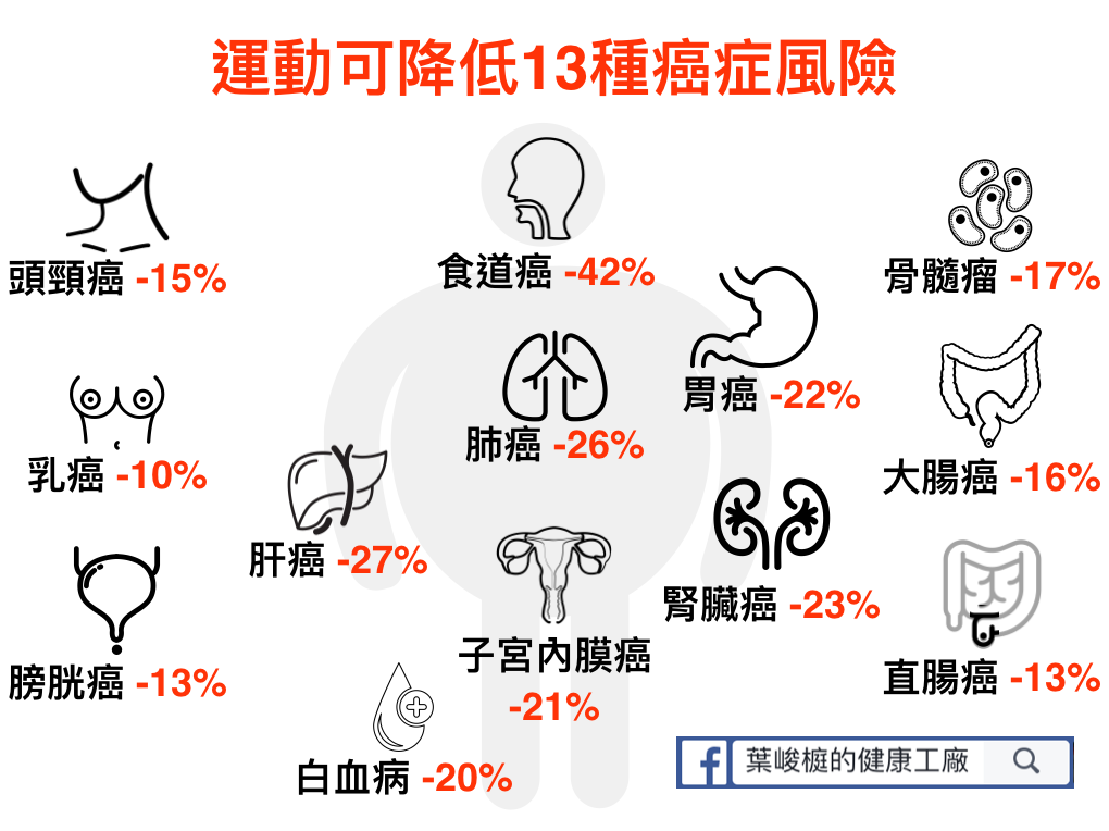 結果發現,運動可以降低13種癌症的風險,分別是食道癌 (-42%),肝癌 (-27%),肺癌 (-26%),腎臟癌 (-23%),胃癌 (-22%),子宮內膜癌 (-21%),白血病 (-20%),骨髓瘤 (-17%),大腸癌 (-16%),頭頸癌 (-15%),直腸癌 (-13%),膀胱癌 (-13%) 跟乳癌 (-10%)。