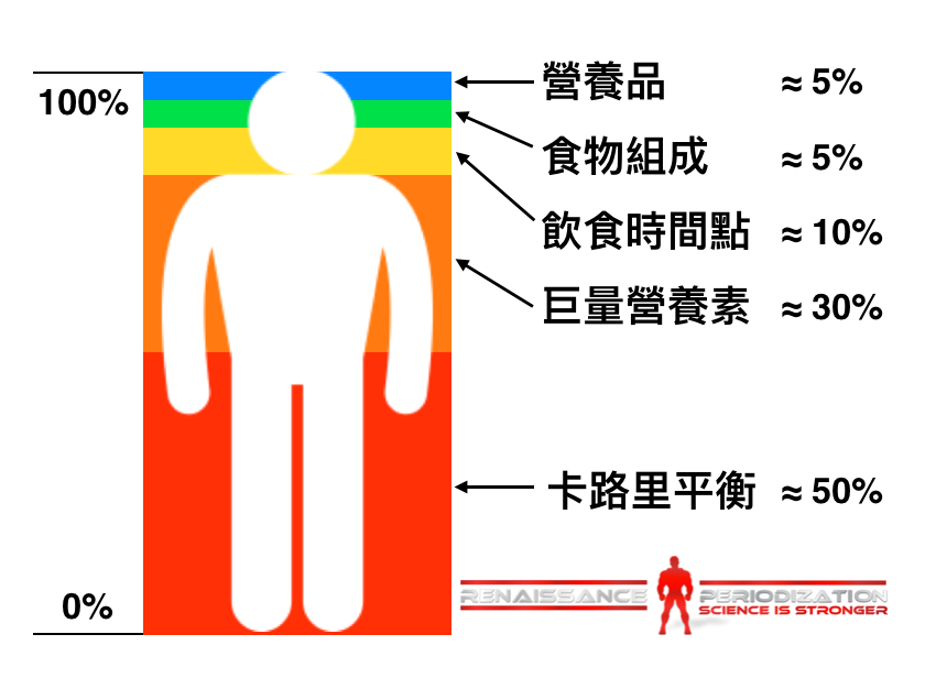 建構人體組成,在飲食控制部分,可粗略分成卡路里平衡 (Calorie balance,約佔50%)、巨量營養素 (Macronutrients,約佔30%)、飲食時間點 (Nutrient timing,約佔10%)、食物組成 (Food composition,約佔5%)、營養品 (Supplements,約佔5%)。飲食控制的大原則,先處理最重要的基礎問題,等基礎問題解決後,再處理更高階的問題。