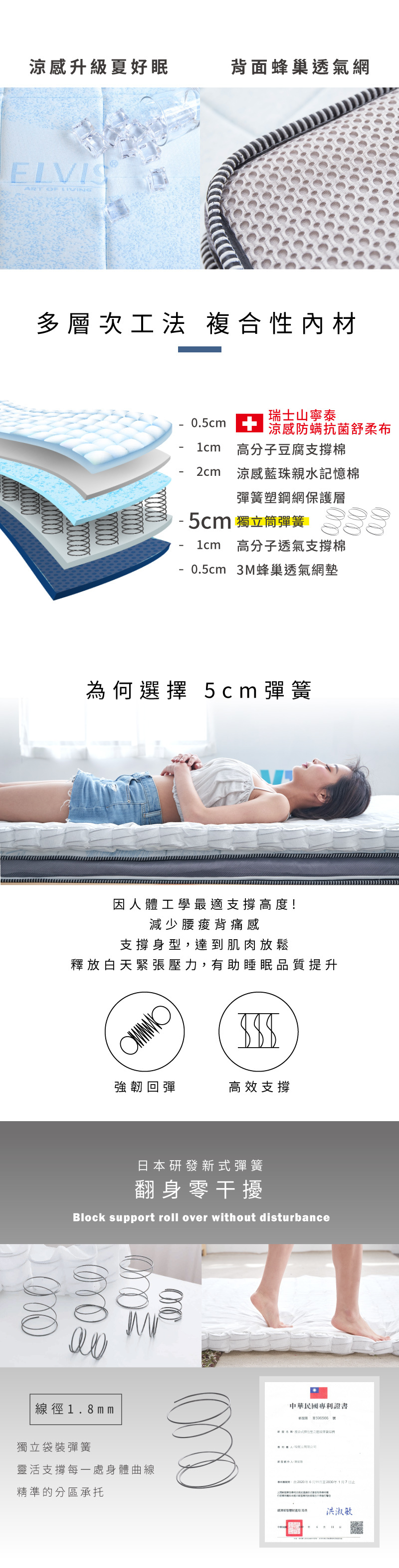表布 瑞士防蹣防霉抗菌機能布 .添加日本ExtraCold 涼感纖維 Quilting高分子泡綿1.8公分 3M蜂巢透氣網墊