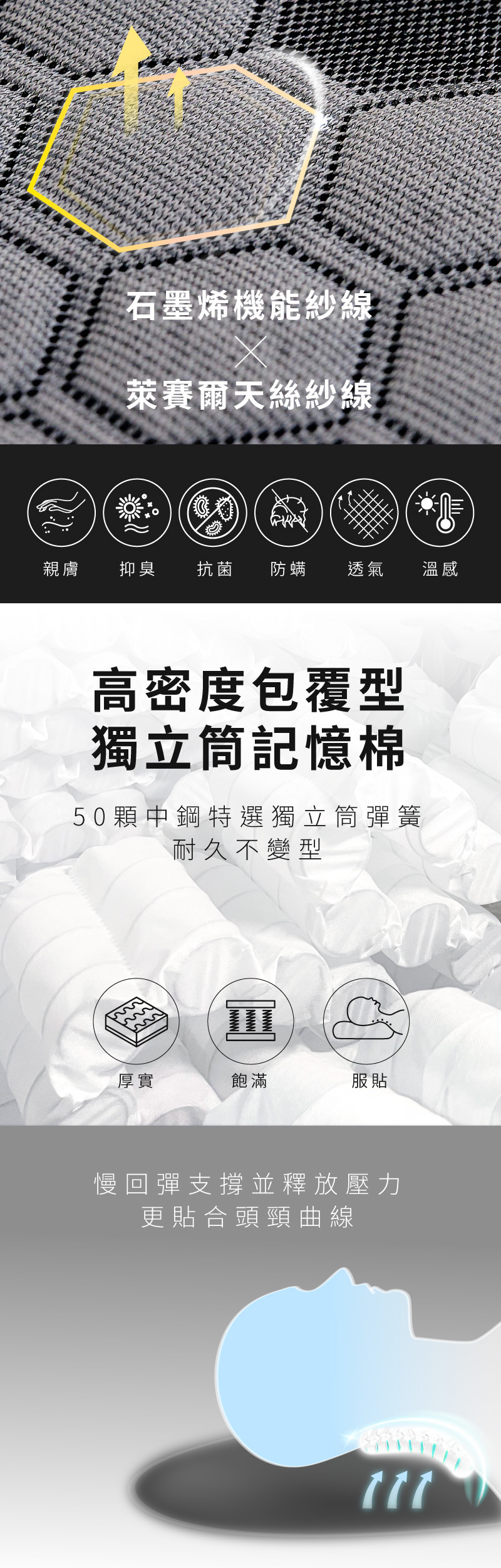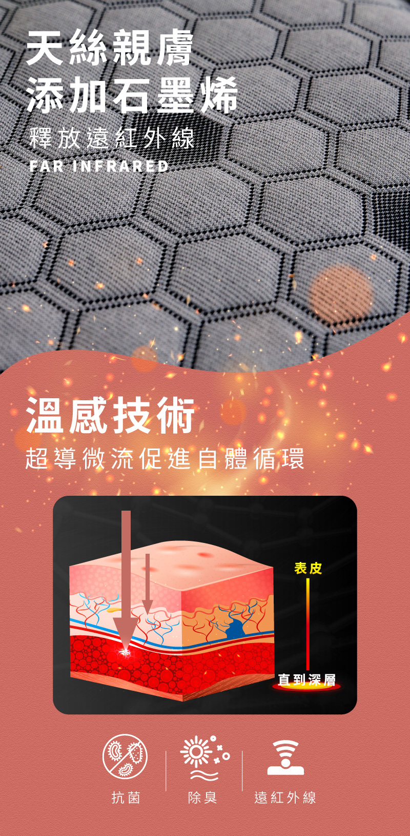 天絲親膚,添加石墨烯,釋放遠紅外線,溫感技術,超導微流促進自體循環。
