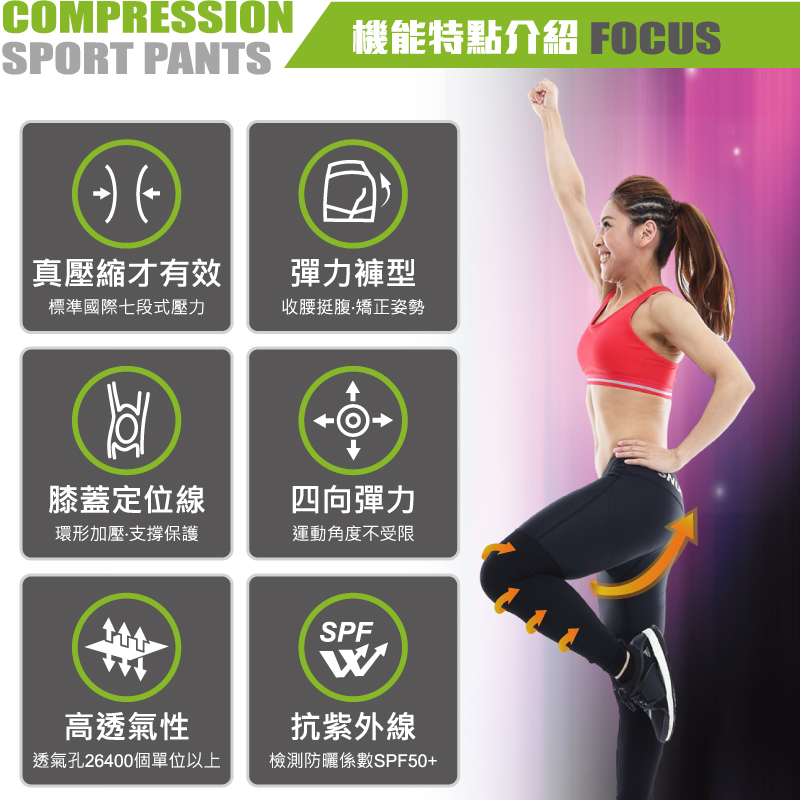 功能:運動加壓循環,有效固定肌肉方向,減少肌肉耗損,集中效能