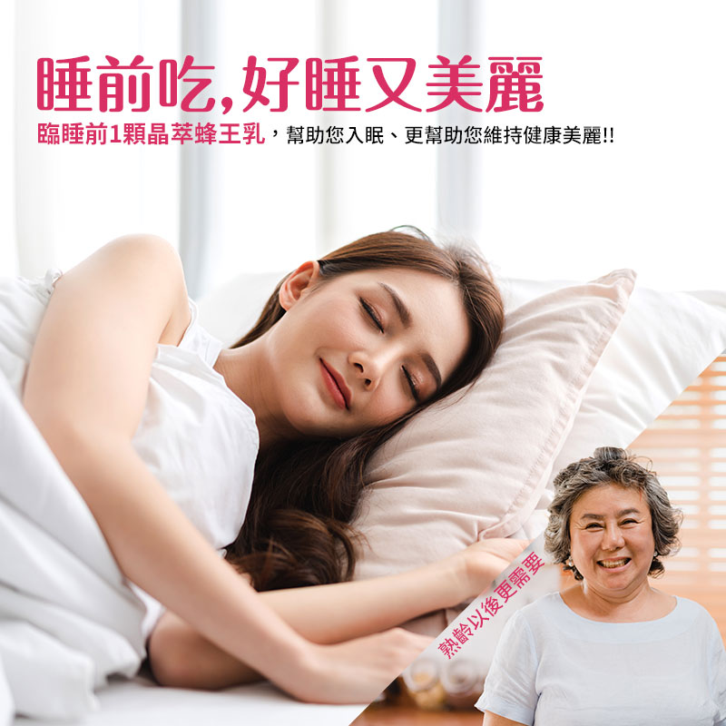 (或是)臨睡前1顆晶萃蜂王乳,幫助您入眠、更幫助您維持健康美麗