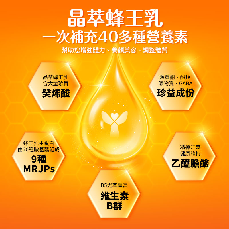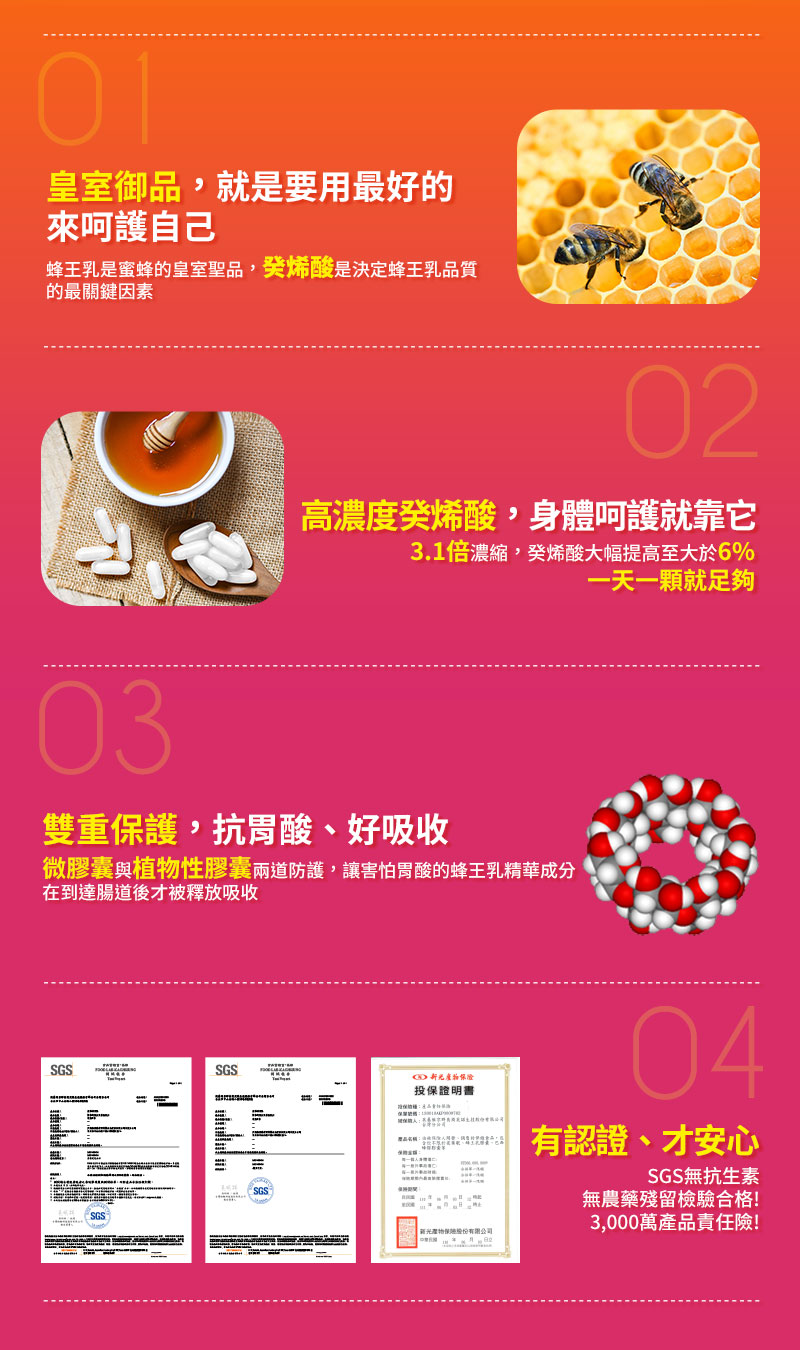 * 微膠囊及植物性膠囊雙重保護,蜂王乳精華成分到達腸道才釋出吸收